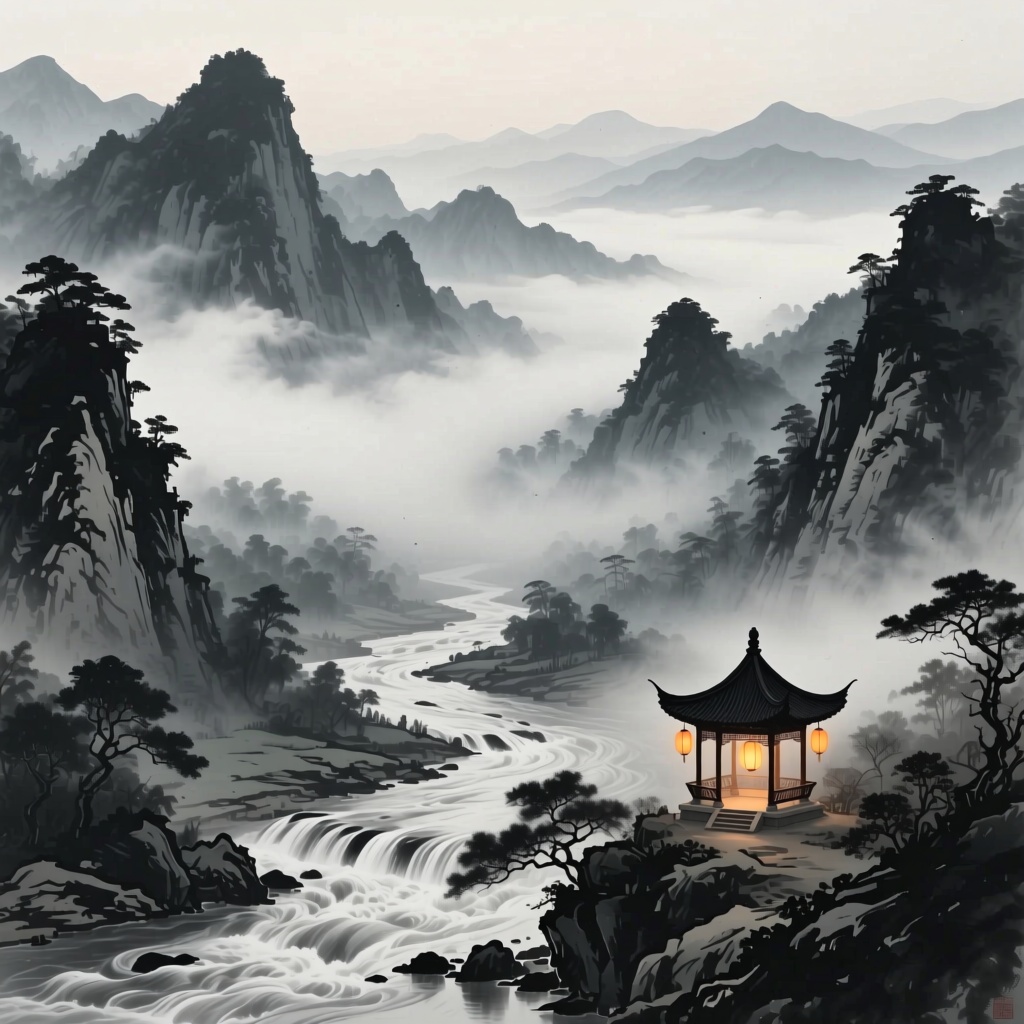 A vast ink-wash landscape where misty mountains rise into drifting clouds, rivers flowing like silver threads across valleys. In the distance, a solitary pavilion glows with warm lantern light, blending classical Chinese painting aesthetics with modern cinematic realism.Width of the output image.