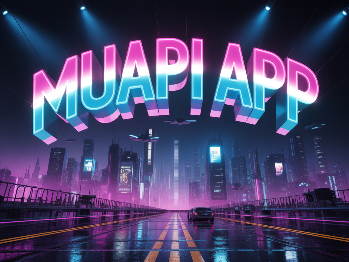 A retro 80s style poster with the words 'MUAPI APP' glowing in pink and blue neon lights, cyberpunk city skyline in the background, cinematic design, highly detailed.Submit Your Request: