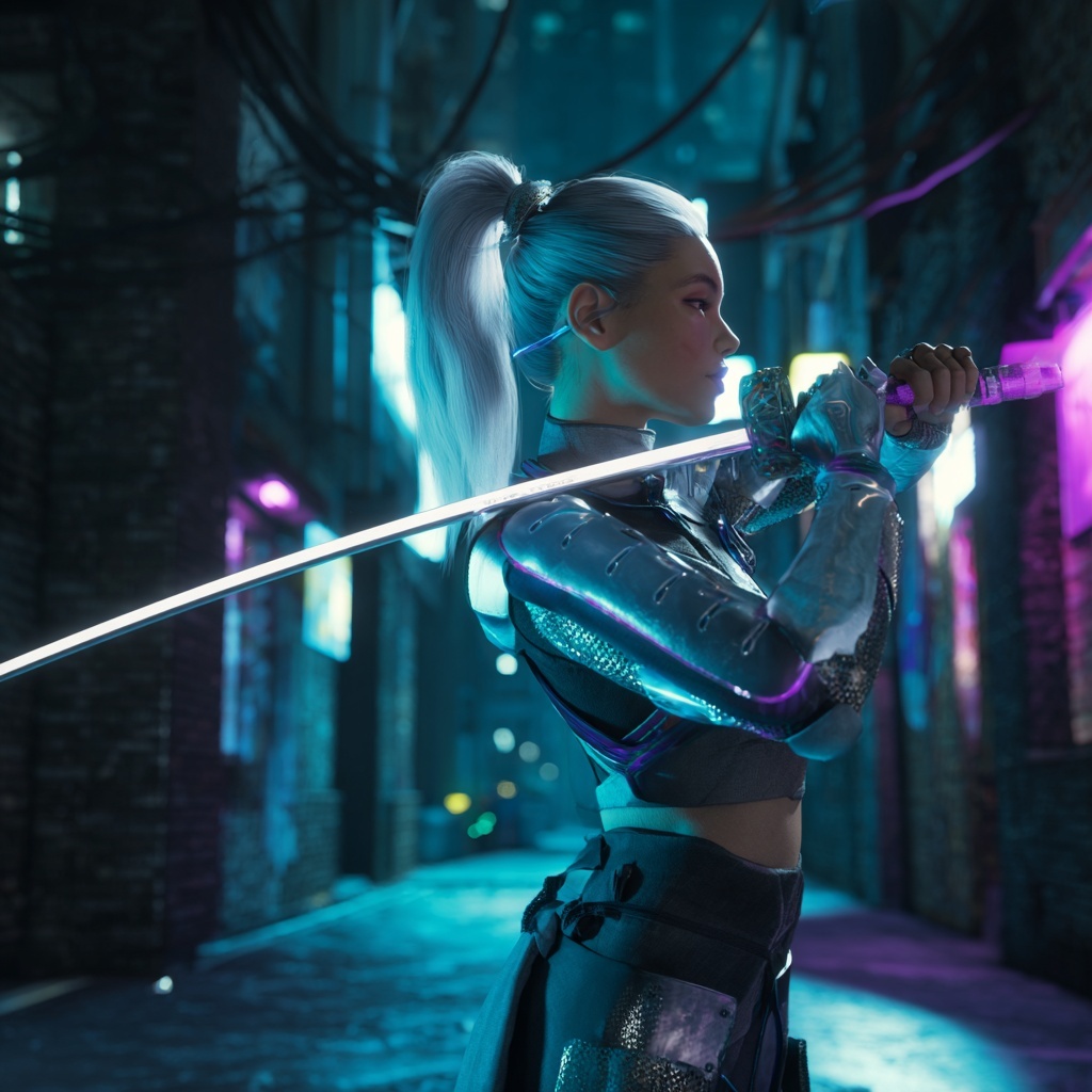 A futuristic samurai girl exploring an ancient overgrown temple in a neon-lit jungle, glowing plants surrounding her, mist in the air, cinematic composition.URL of the input image.