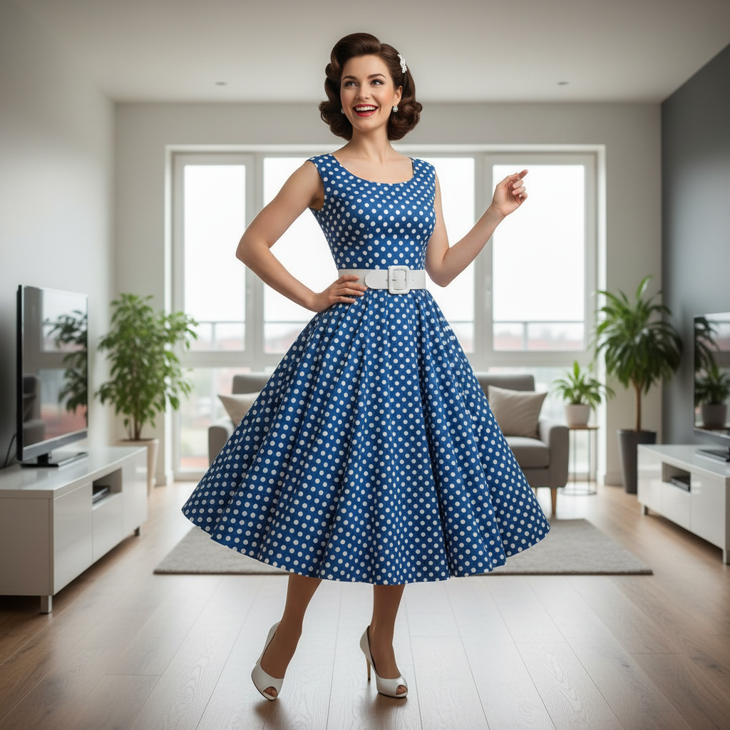 A portrait of me in a modern living room. Change it so I’m dressed in 1950s attire with a polka-dot dress, while maintaining my face and hairstyle.Aspect ratio of the output image.