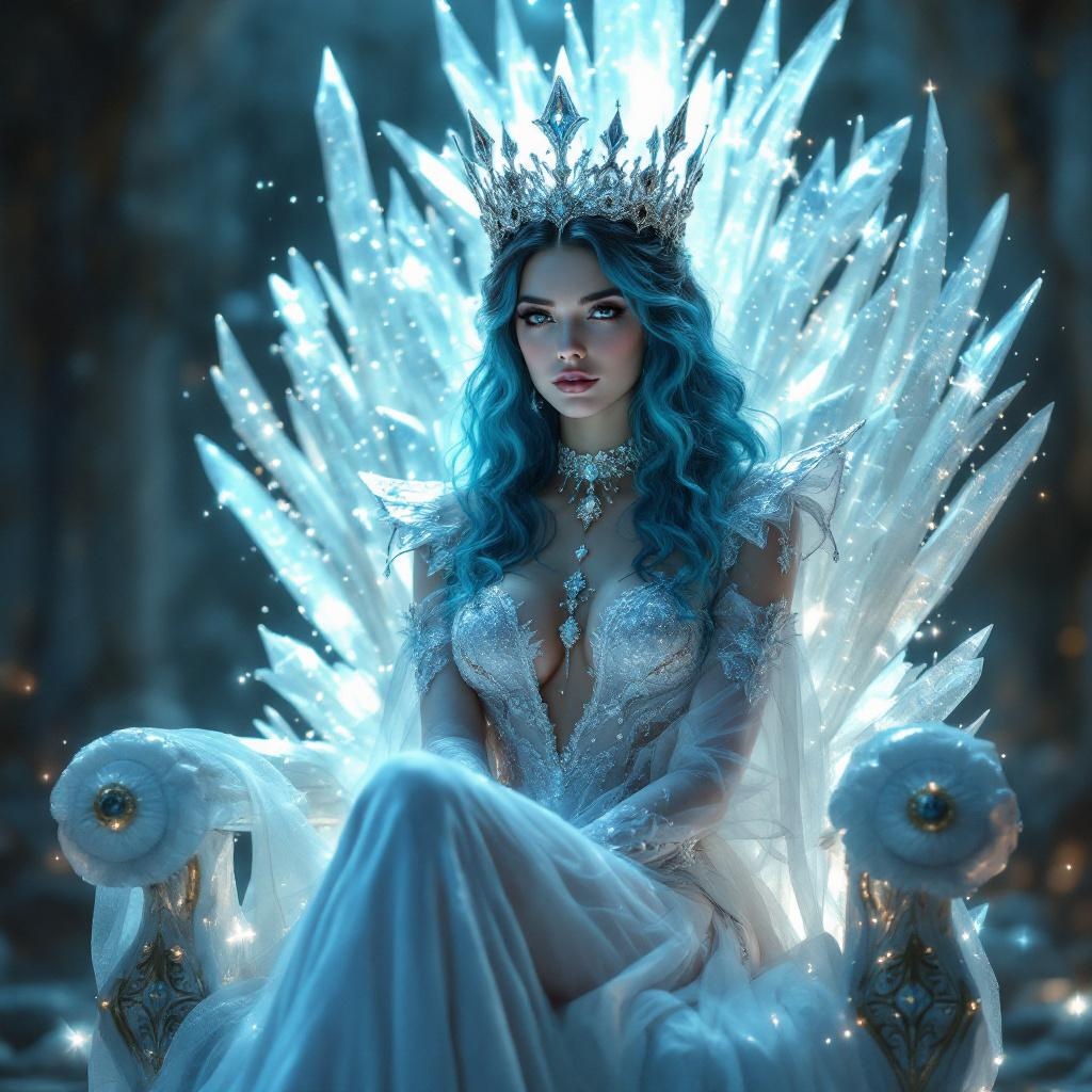 An elegant fantasy queen sitting on a crystal throne, shimmering crown, ethereal lighting, magical atmosphere.Width of the output image.