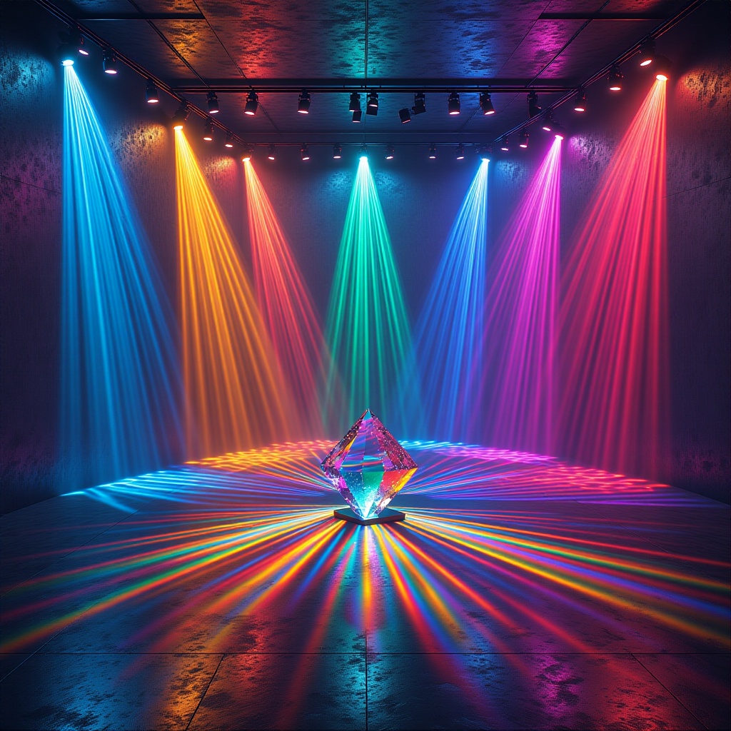 A futuristic studio bathed in radiant beams of shifting neon colors — cyan, magenta, amber, and emerald — that blend into surreal gradients across walls and objects. A crystal-like prism floats at the center, splitting light into vibrant chromatic waves that ripple outward, painting the scene in glowing, ever-changing hues.Width of the output image.