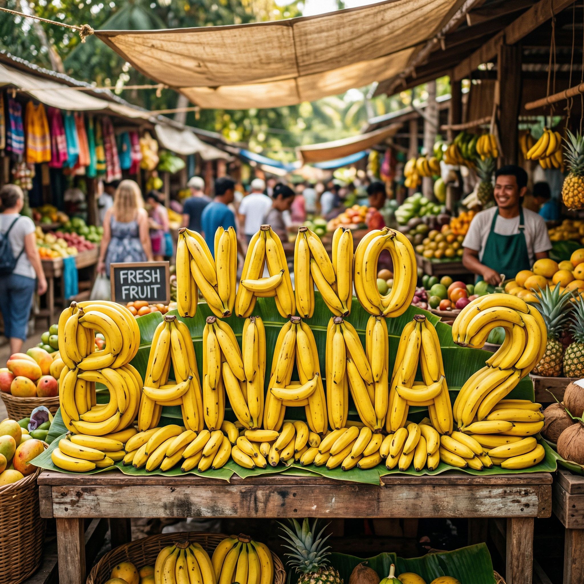 | Prompt | string | Text prompt describing the desired image content. | A playful, vibrant fruit market scene with bright natural lighting and rich colors. In the center, giant bananas are arranged carefully to form bold, physical letters, stacked and curved naturally, with realistic texture, yellow peel details, and soft shadows on the ground. The bananas look fresh, glossy, and dimensional, like real objects sculpted into typography. The camera angle is slightly low and centered to make the text feel large and dominant.