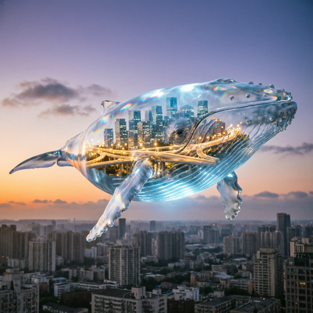 A massive transparent whale floating through the sky above a city, inside its body a fully lit miniature city with skyscrapers and highways, surreal cinematic lighting, ultra detailedAspect ratio of the output image.