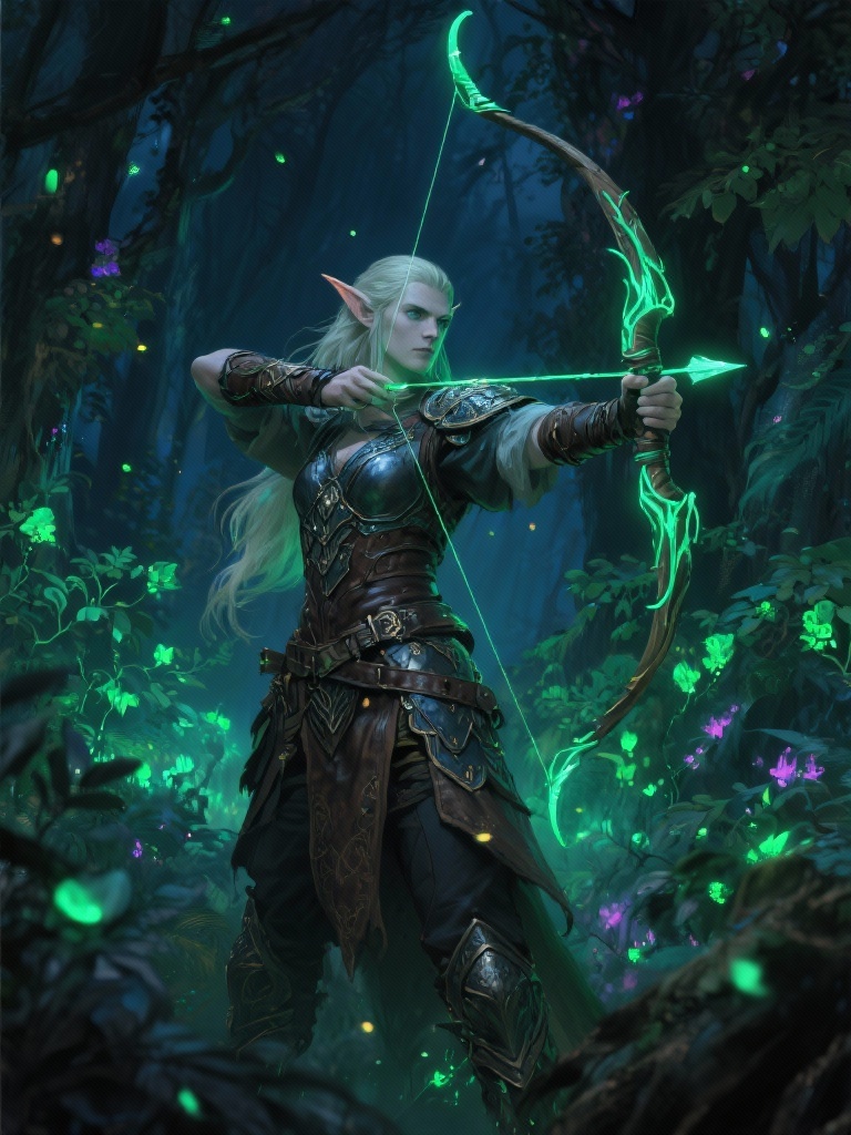 An elven archer standing in a bioluminescent forest at night, glowing foliage, intricate leather armor, dynamic pose, painterly high-detail concept art.Width of the output image.